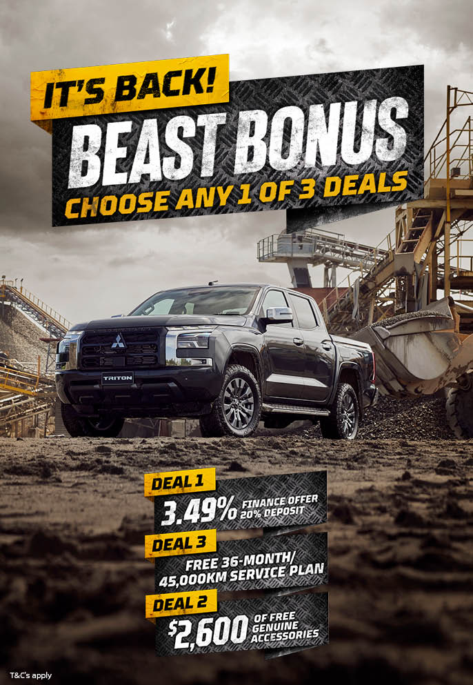 Prices exclude On Road Costs of up to $1,350 which includes WoF, Registration, Road User Charges, a full tank of fuel and a Tyrewise stewardship fee of $66.50. The “3.49% p.a. with 20% Deposit” offer is based on New Mitsubishi Triton Double Cab 2WD and 4WD models only. 3.49% p.a. interest rate is fixed for the 36-month term of the loan. The offer includes a $130 UDC establishment fee, $10.35 PPSR fee, a weekly maintenance fee of $0.50, and a dealer origination fee of $350 will apply. $1,350 ORC can be included in the finance offer or paid upfront. The offer is valid from the 8th of September 2025 until the 31st of December or while stocks last and is only available for New Mitsubishi Triton Double Cab 2WD and 4WD models. Mitsubishi Finance is provided through UDC Finance Limited. UDC’s lending criteria, standard terms and conditions apply. “BEASTPACK” accessories offer includes Genuine Deck Liner, Fitted Tow Bar + Wiring Kit and the choice of Carpet or Rubber mats. Deck Liner available on Double Cab Wellside models only. Offer non-transferable, changeable, or redeemable for cash and only available on eligible models. Labour/accessory fitment costs at dealer expense. “Free Service” offer covers your first three scheduled services. Services are due every 12 months or 15,000km, whichever comes first. Free service covers an A Service, B Service and A Service, as stipulated in your Triton’s Maintenance and Warranty Booklet. Only valid at an authorised MMNZ dealership. Offer is transferable to subsequent owners within the terms. Excludes WOF, general wear and tear and maintenance items such as tyres, brake pads etc. “Beast Bonus” offers are separate items and cannot be redeemed together.